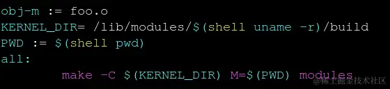 也就是进入到kernel目录,利用kbuild系统来编译驱动文件。obj-m 告诉编译系统需要编译成一个module(.ko),foo.o表明需要源文件是foo.c或者foo.S,如果驱动模块包含多个文件(如: foo_main.c, foo_common.c),写法如下: