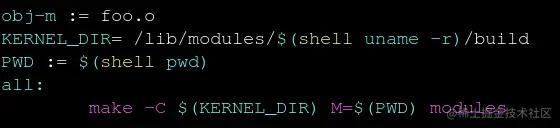 也就是进入到kernel目录,利用kbuild系统来编译驱动文件。obj-m 告诉编译系统需要编译成一个module(.ko),foo.o表明需要源文件是foo.c或者foo.S,如果驱动模块包含多个文件(如: foo_main.c, foo_common.c),写法如下: