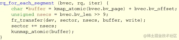 kernel 提供了一些宏来帮助遍历请求列表。对请求的处理策略,就是Block驱动最核心最精华的部分,开发者得根据设备的物理特性来提高访问效率,解决并发拥堵等问题。 *fr_queue_rq()* -- ‘**请求队列’**处理函数,在初始化请求队列时设置,Loop处理每个请求: