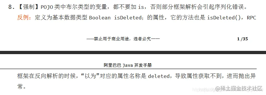 其实阿里巴巴发布的java开发手册中就写明了,强制规定,布尔类型的数据,无论是boolean还是Boolean都不准使用isXXX来命名