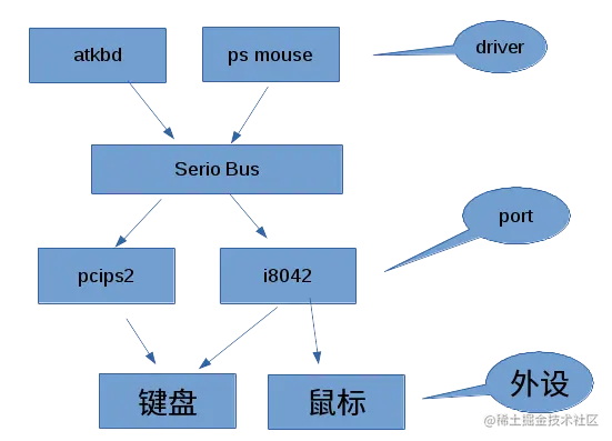 application --> /dev/input/eventX --> Input 子系统 --> atkdb驱动 --> serio bus --> i8042 port --> 物理键盘。