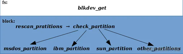 Block子系统主要是提供最底层的数据读写,也就是raw io,文件系统使用它进行IO操作,文件系统只专注于文件系统格式,以读取分区为例: 文件系统在初始化阶段,会call blkdev_get, 如果块设备还没有初始化,blkdev_get 则 调用块设备的 rescan_partitions, 去扫描分区,初始化设备。