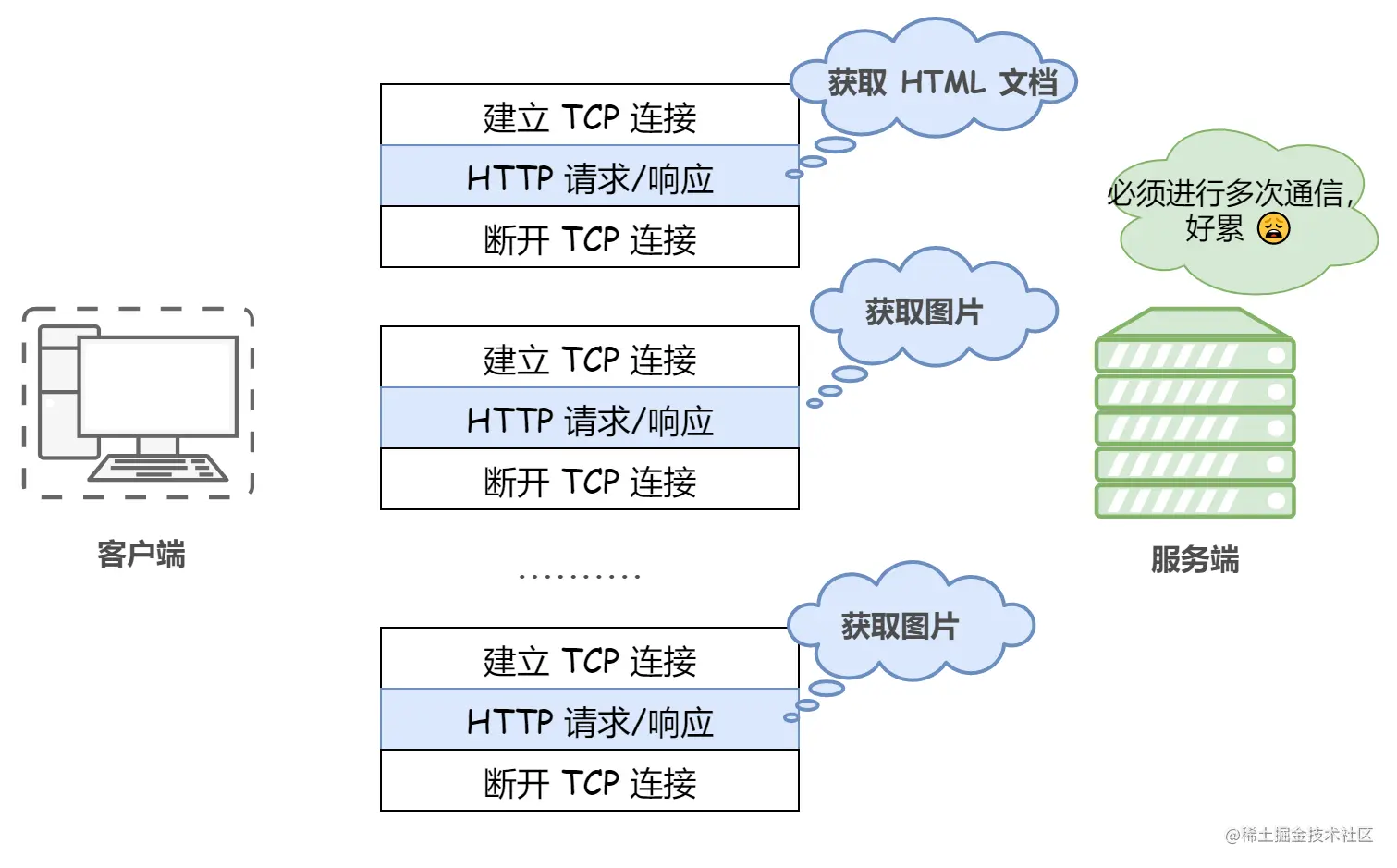 显然,这种方式存在巨大的弊端。比如访问一个包含多张图片的 HTML 页面,每请求一张图片资源就会造成无谓的 TCP 连接的建立和断开,大大增加了通信量的开销