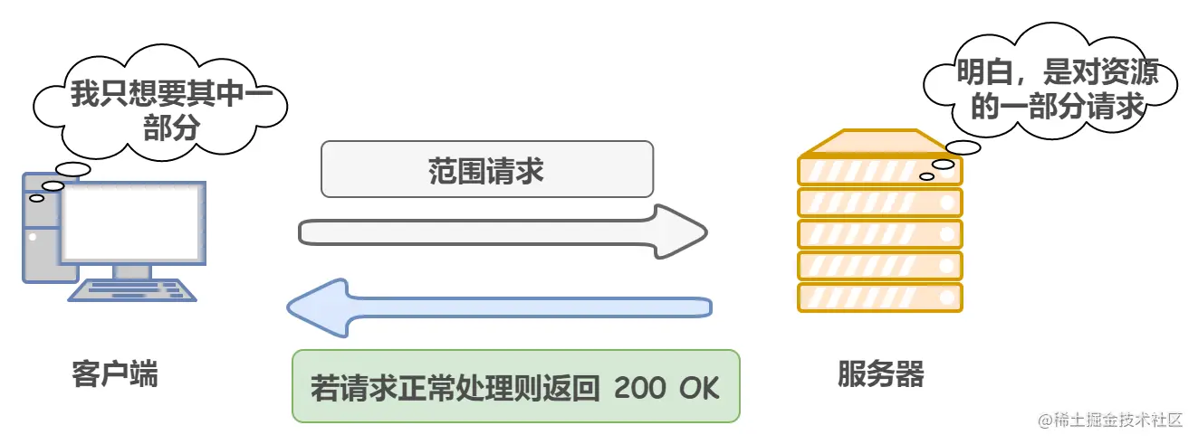 这是一个非常常见的功能,原理很简单,其实就是 HTTP 请求头中的字段 Range 和响应头中的字段 Content-Range 的简单使用。客户端一块一块的请求数据,最后将下载回来的数据块拼接成完整的数据。打个比方,浏览器请求服务器上的一个服务,所发出的请求如下: