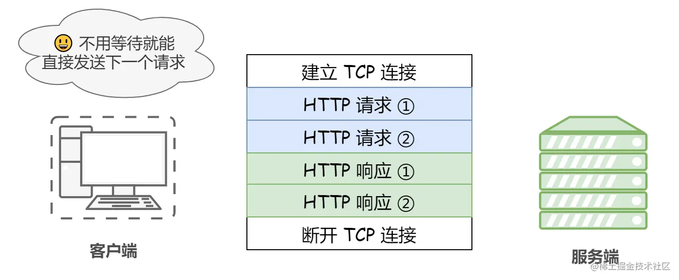 持久连接使得多数请求以流水线(管线化 pipeline)方式发送成为可能,即在同一条持久连接上连续发出请求,而不用等待响应返回后再发送,这样就可以做到同时并行发送多个请求,而不需要一个接一个地等待响应了。