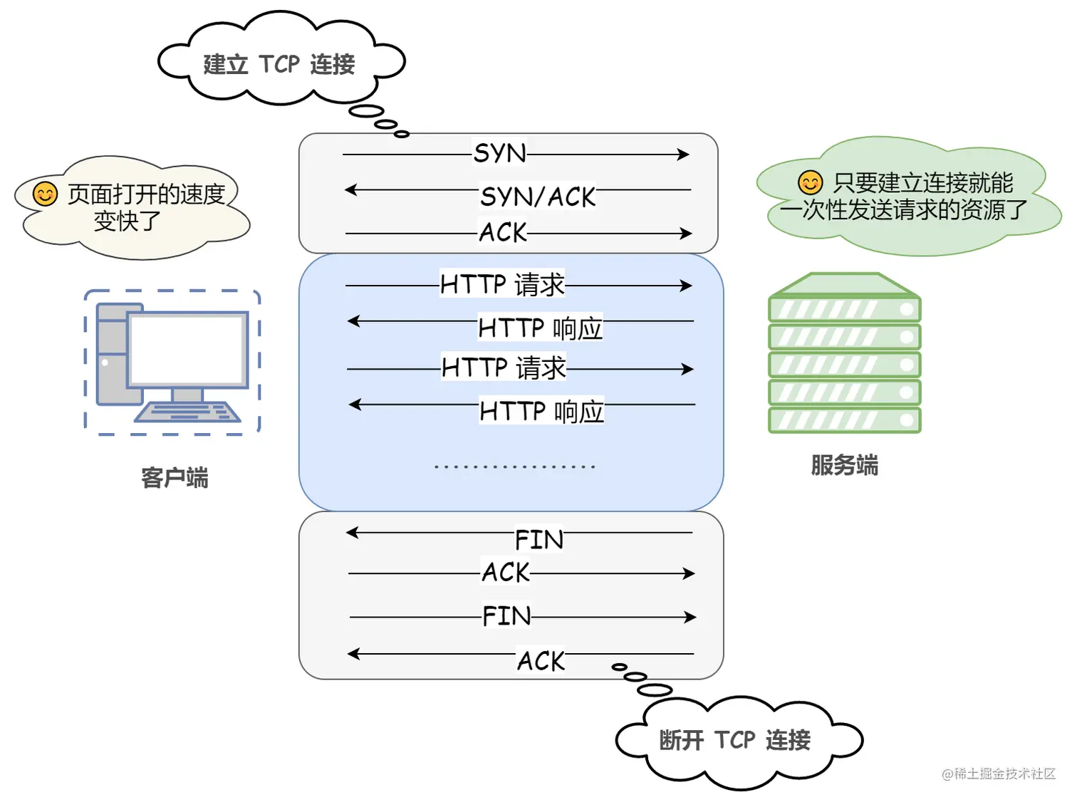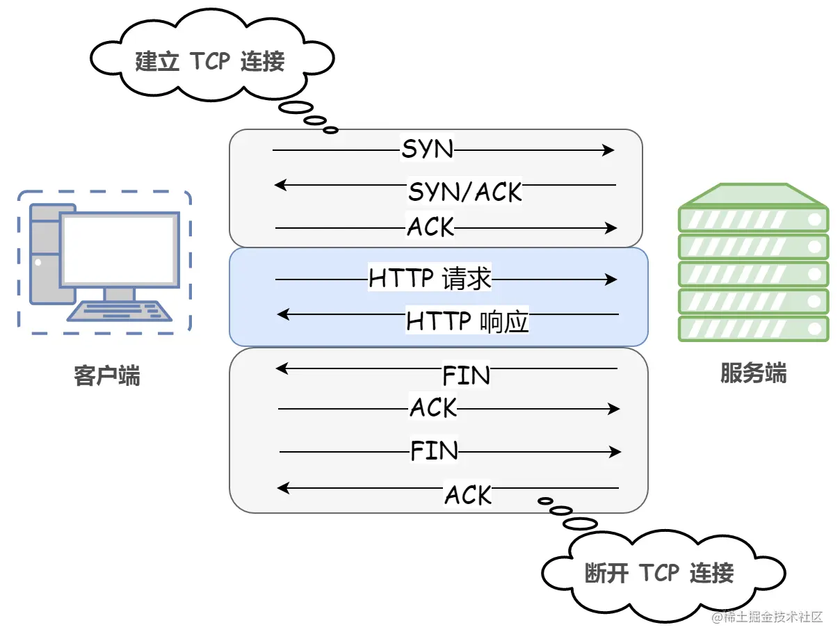 也就是说每次 HTTP 请求都要重新建立一次连接。由于 HTTP 是基于 TCP/IP 协议的,所以连接的每一次建立或者断开都需要 TCP 三次握手或者 TCP 四次挥手的开销。