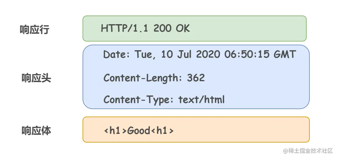 在响应行开头的 HTTP 1.1 表示服务器对应的 HTTP 版本。紧随的 200 OK 表示请求的处理结果的状态码和原因短语。