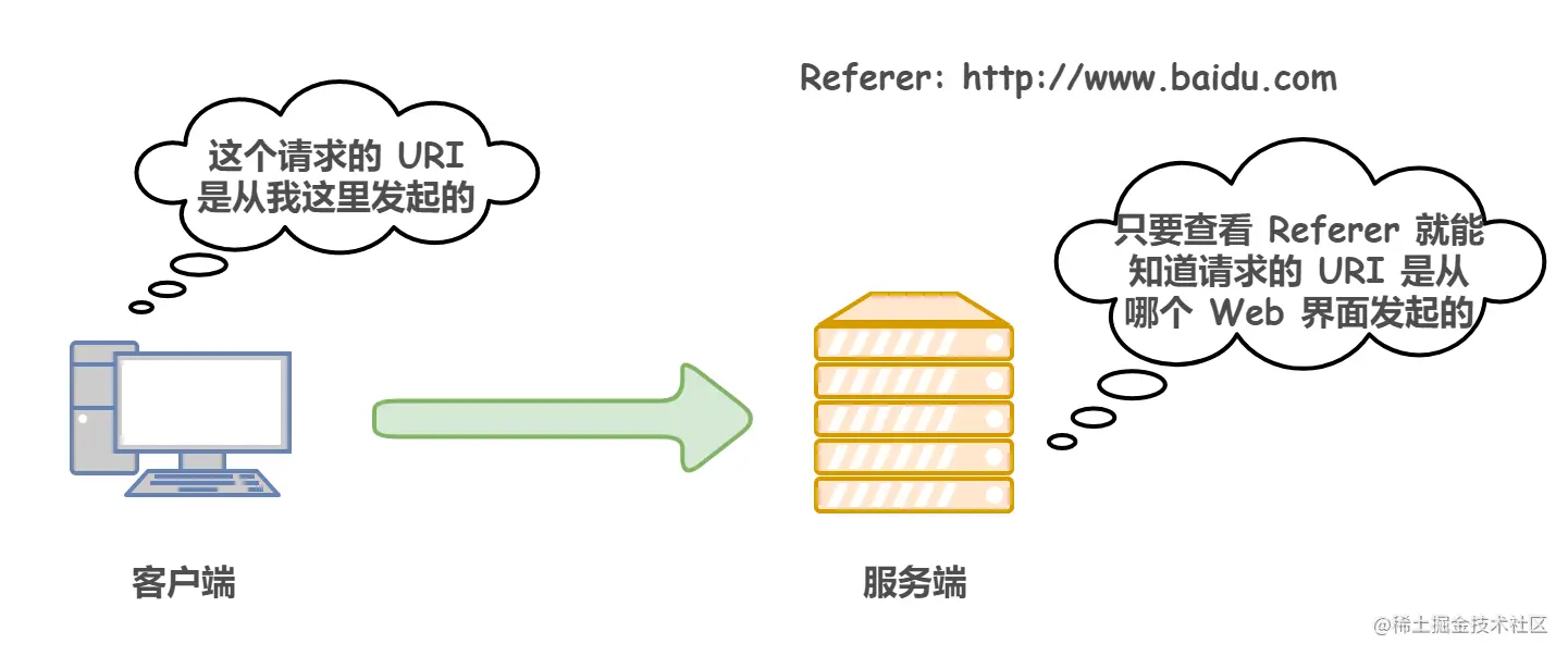 1)Referer:表示这个请求是从哪个 URI 跳过来的。比如说通过百度来搜索淘宝网,那么在进入淘宝网的请求报文中,Referer 的值就是:www.baidu.com。如果是直接访问就不会有这个头。这个字段通常用于防盗链。