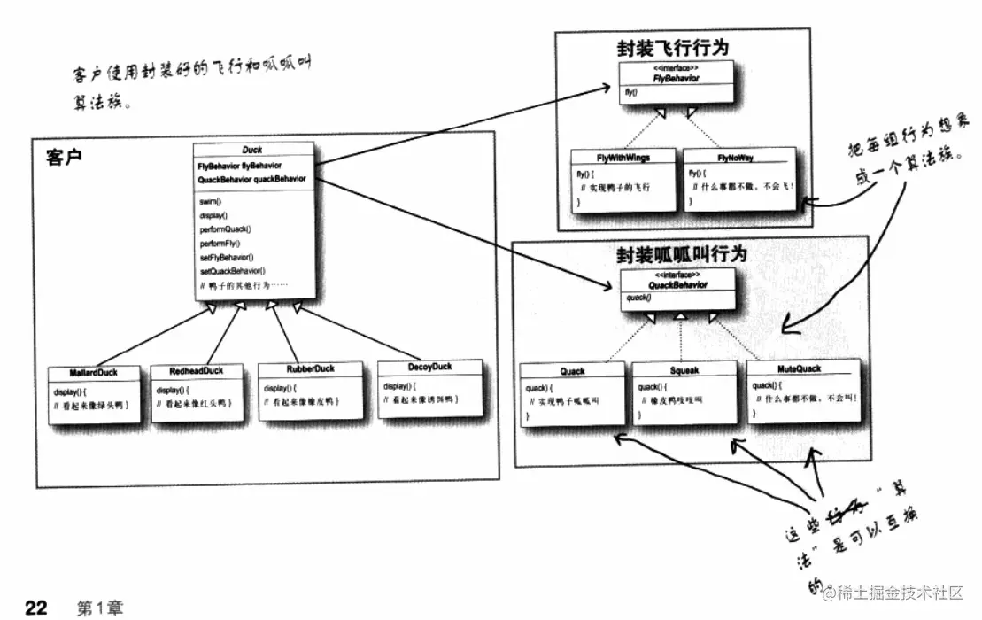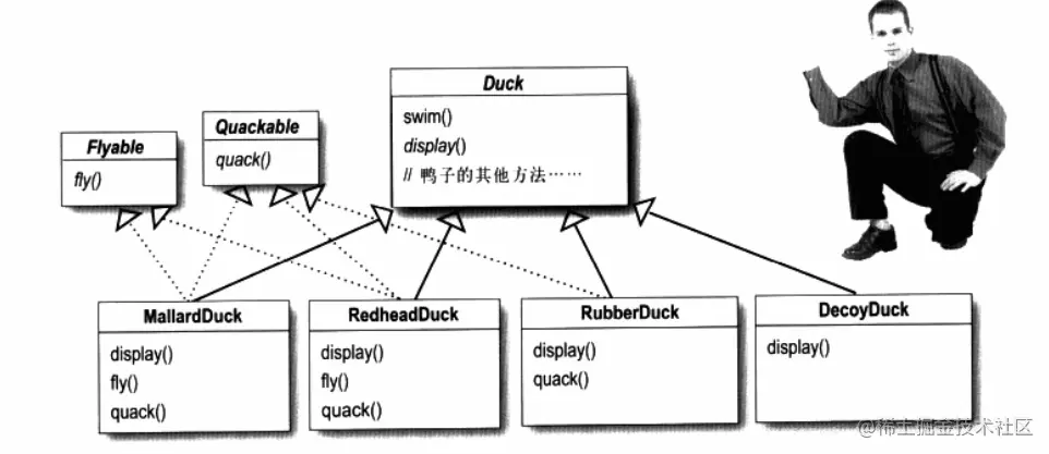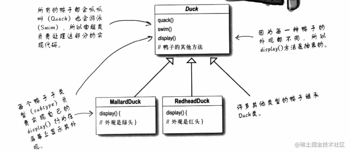 每个鸭子子类有各自相同的方法和不同的方法,不同方法都要自己重写覆盖。而且有些鸭子子类无需父类中的方法,但父类已经声明了方法,导致子类也继承了父类的方法。例如Duck中定义fly()方法,Mallard Duck和Redhead Duck会飞,而Rubber Duck不会飞,但是继承了Duck类的fly方法,这显然不是我们期望的。