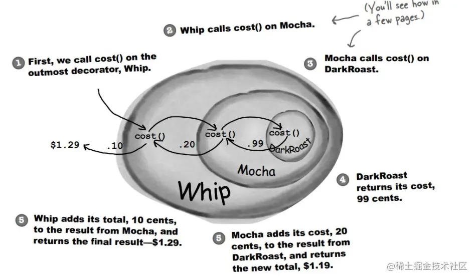 下图表示在 DarkRoast 饮料上新增新添加 Mocha 配料,之后又添加了 Whip 配料。DarkRoast 被 Mocha 包裹,Mocha 又被 MilkWhip 包裹。它们都继承自相同父类,都有 cost() 方法,外层类的 cost() 方法调用了内层类的 cost() 方法。