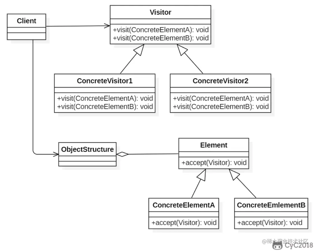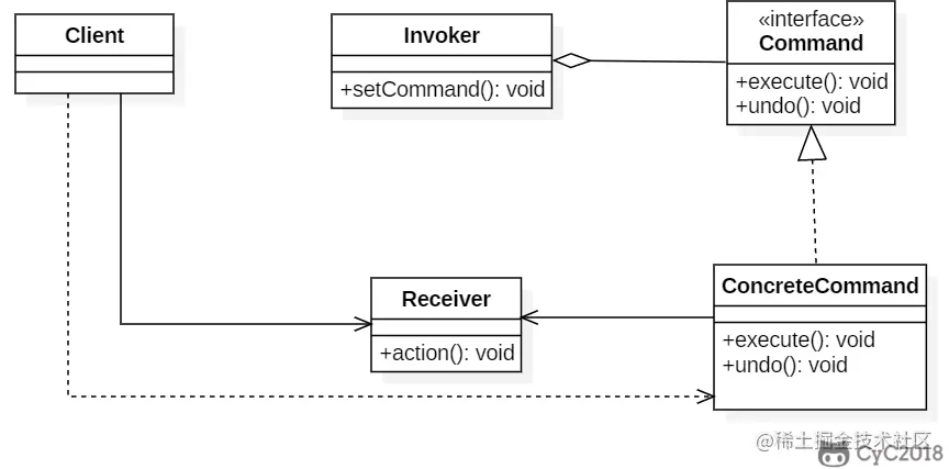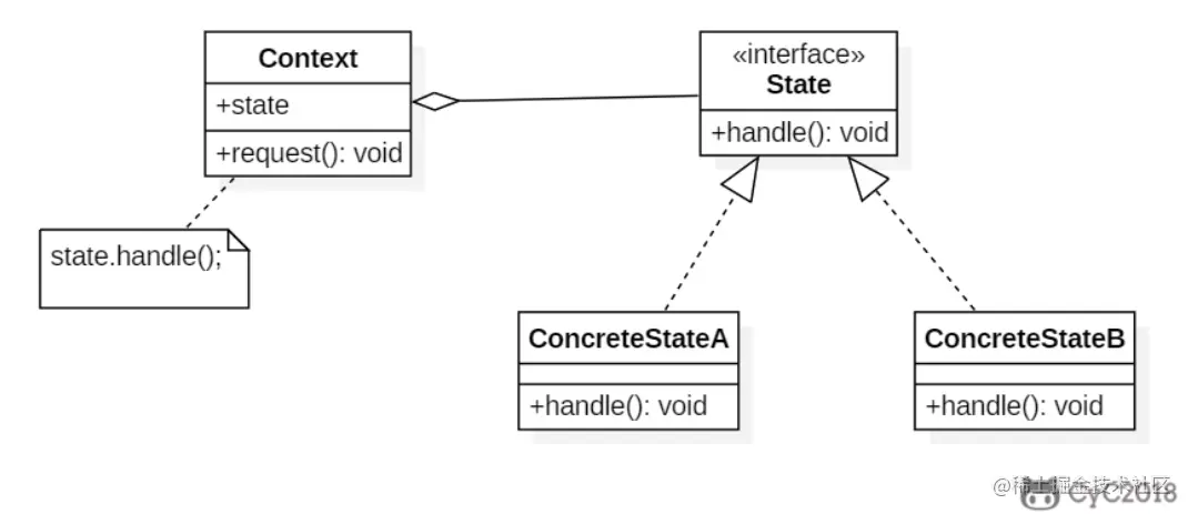 状态模式的类图和策略模式类似,并且都是能够动态改变对象的行为。但是状态模式是通过状态转移来改变 Context 所组合的 State 对象,而策略模式是通过 Context 本身的决策来改变组合的 Strategy 对象。所谓的状态转移,是指 Context 在运行过程中由于一些条件发生改变而使得 State 对象发生改变,注意必须要是在运行过程中。
