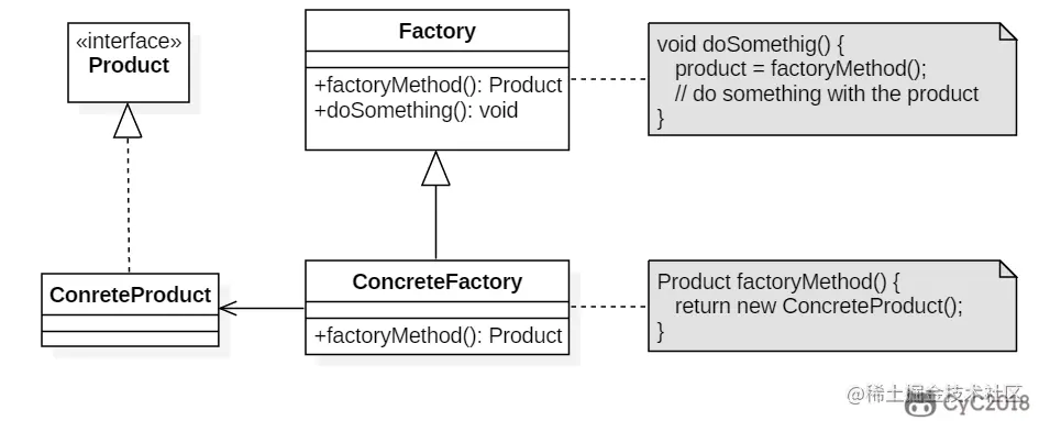 下图中,Factory 有一个 doSomething() 方法,这个方法需要用到一个产品对象,这个产品对象由 factoryMethod() 方法创建。该方法是抽象的,需要由子类去实现。