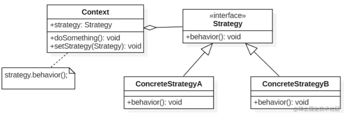 Context是使用到该算法族的类,它的dosomething()方法会调用behavior(),setStrategy(Strategy)方法可以动态地改变strategy对象,即动态改变Context使用的算法。
