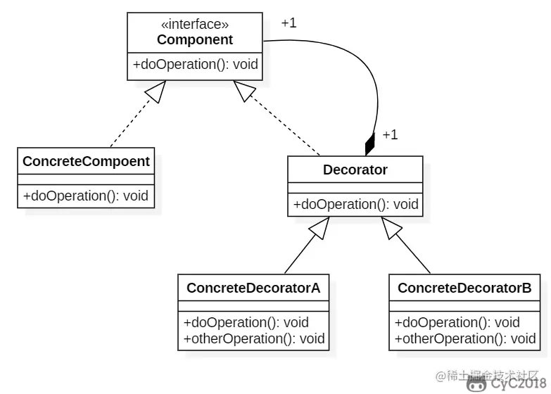 装饰者(Decorator)和具体组件(ConcreteComponent)都继承自组件(Component),具体组件的方法实现不需要依赖于其它对象,而装饰者组合了一个组件,这样它可以装饰其它装饰者或者具体组件。所谓装饰,就是把这个装饰者套在被装饰者之上,从而动态扩展被装饰者的功能。装饰者的方法有一部分是自己的,这属于它的功能,然后调用被装饰者的方法实现,从而也保留了被装饰者的功能。可以看到,具体组件应当是装饰层次的最低层,因为只有具体组件的方法实现不需要依赖于其它对象。