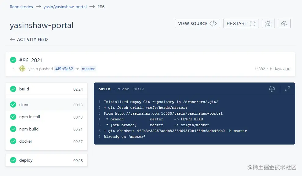 在我们的项目根目录创建一个.drone.yml文件,即可配置drone的CI/CD流程,然后提交代码就可以自动触发CI/CD了,是不是非常简单?