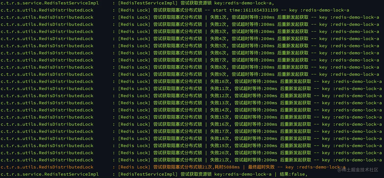 log.warn("[Redis Lock] 尝试获取阻塞式分布式锁{}次,耗时{}ms | 最终超时失败 -- key :{}"