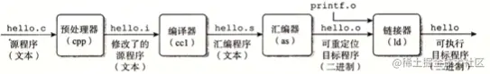 main的定义。它为不同高级语言的不同编译器提供了通用的输出语言。 - 汇编阶段。将指令翻译成及其语言指令,打包成可重定位目标程序的格式,并保存在二进制文件