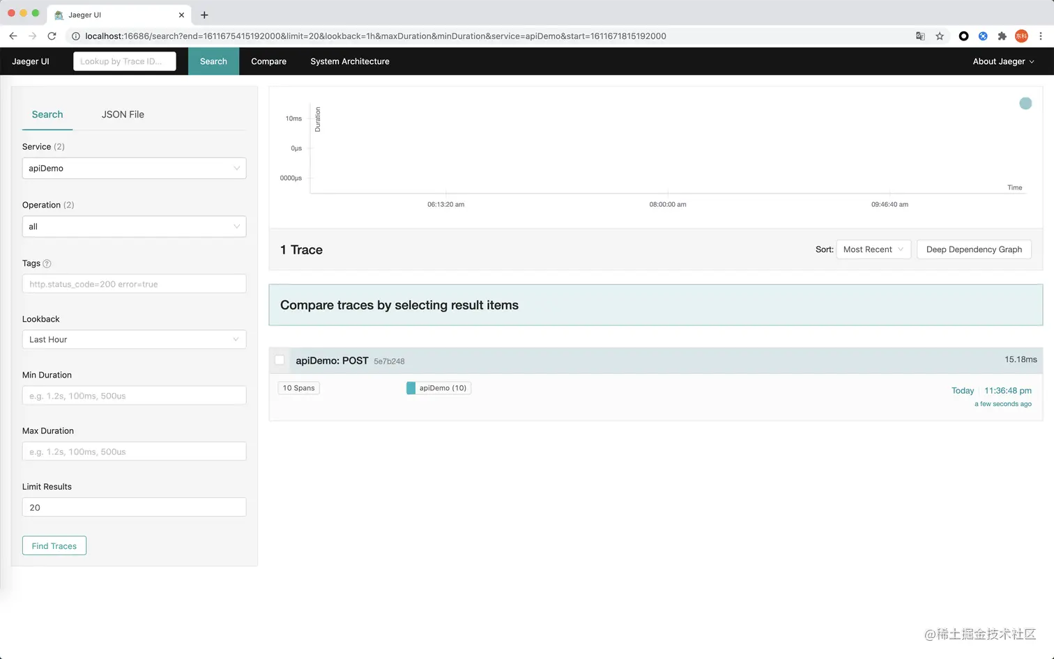 然后访问 jaeger-query ui 。 就可以看到多了一个叫做 apiDemo 的 service。
