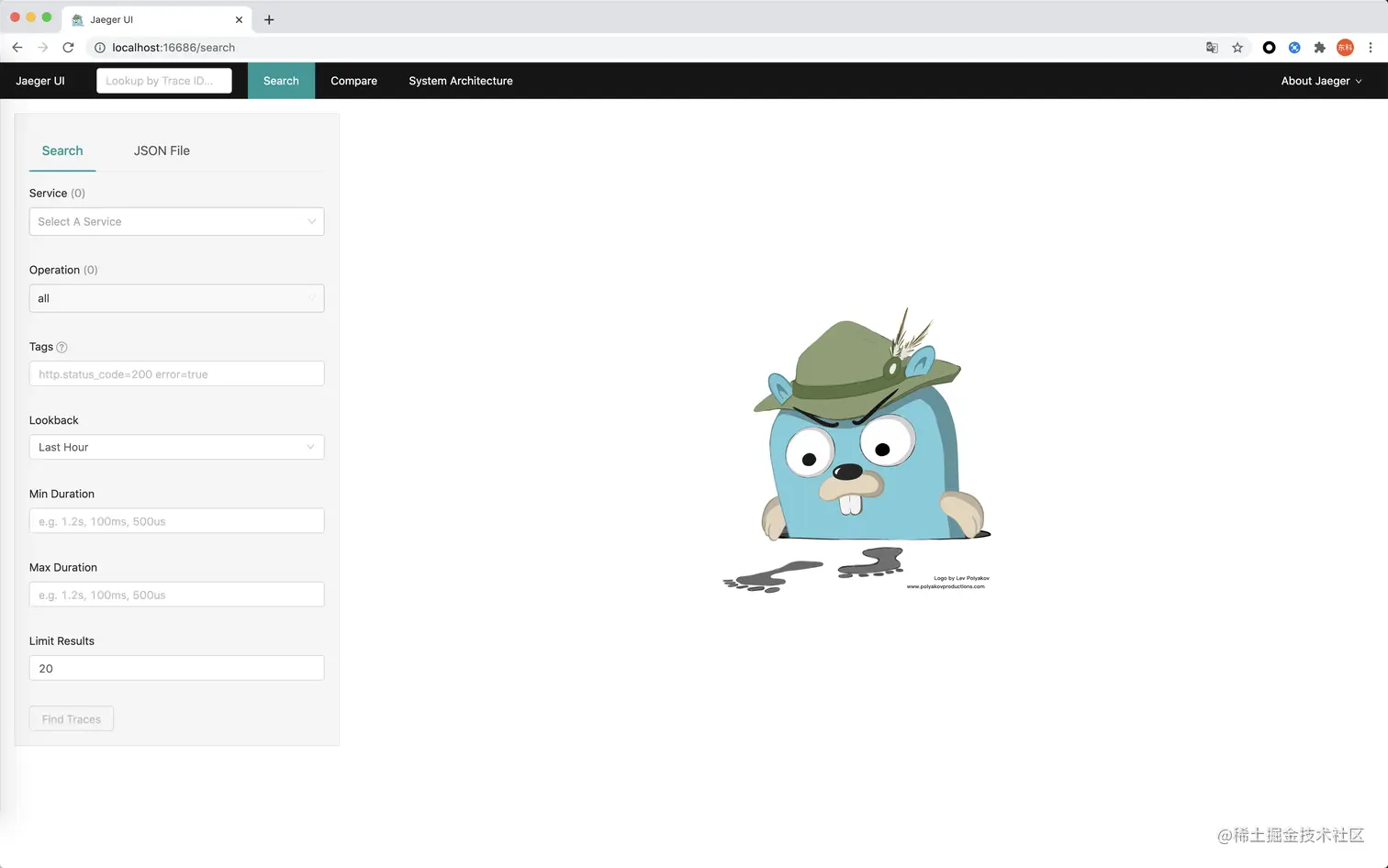 这个时候,就可以通过 http://localhost:16686 访问 jaeger ui 了。但是此时,因为没有任务服务接入,所以 Service 还没有可选项目。