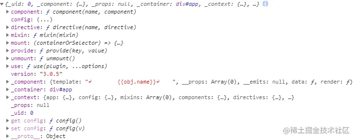 实现链式调用的方法很巧妙,从源码中看createApp只是用来包装app实例的,一旦执行createApp内部的app实例就被创建并返回