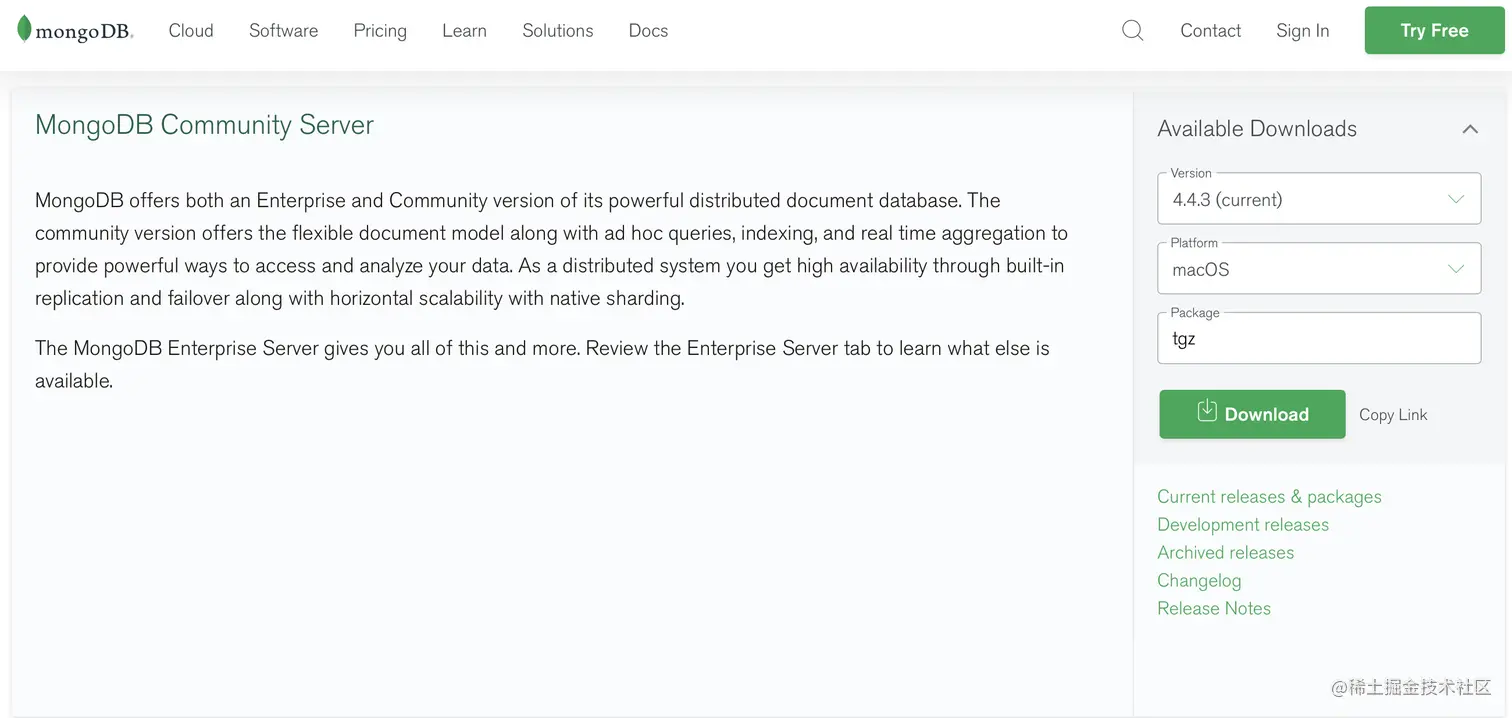 安装mongodb 我们可以通过官网获取安装包和homebrew两个方式来安装,但是homebrew最近好像没法获取到mongodb的包了,所以这里我们选择去官网下载。mongodb下载地址