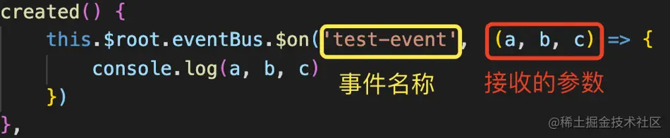 c. 在需要接收参数的组件里,通过this.root.eventBus.on(’事件名称’, (参数)=> { } 从而进行获取所传递的参数