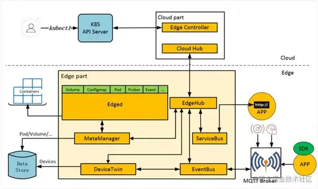 Cloud部分是Kubernetes Master组件、EdgeController和edge Cloudhub所在的地方。