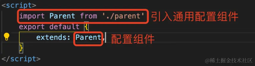 a. 在一个组件内定义好自己想要使用的数据 b. 在另一个需要使用这些数据的组件内引入 c. 然后使用 extends 属性进行继承 d. 这个继承方式只能继承单个组件,继承之后,可以直接使用里面的方法以及定义好的数据下图所示:继承了parent这个组件的东西,parent组件内所定义的所有数据以及方法,可以直接调用