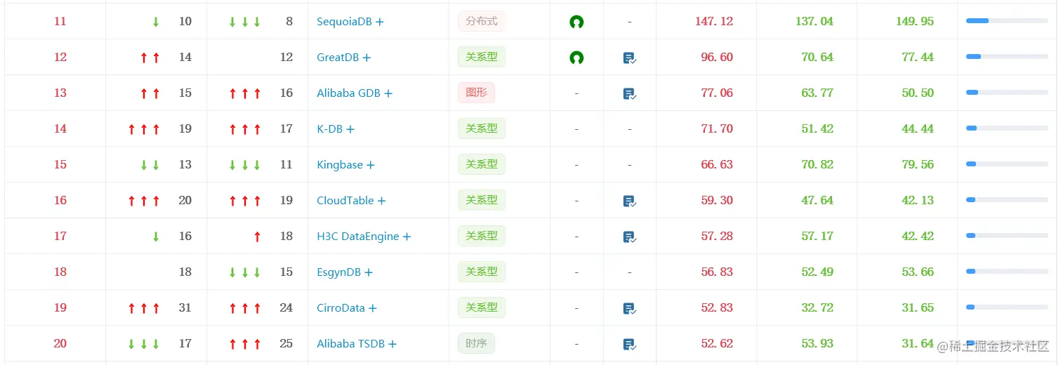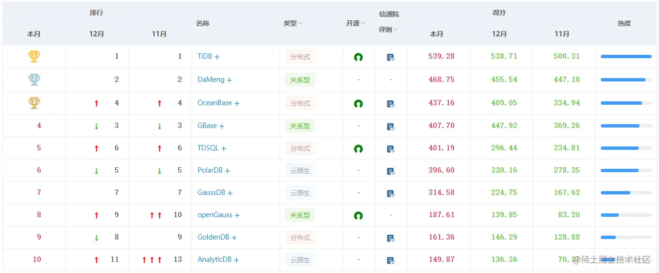 腾讯云 TDSQL、华为云 GaussDB、阿里云 PolarDB是本月前十名中得分增长最高的前三名。