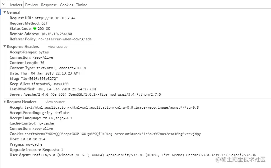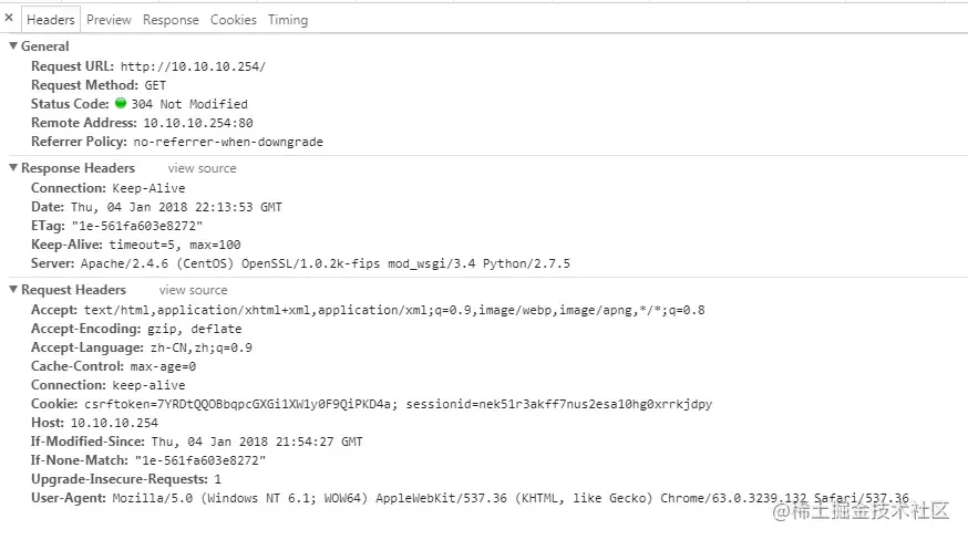 从上述两张截图可看出,第一次web请求响应因为是服务器直接响应的,因此状态码为200。因为第一次请求的响应报文中带有ETag和Last-Modified字段,而且第二次的请求报文中的带有Cache-Contron:max-age=0,因此If-None-Match和If-Modified-Since也自然而然地被添加到了请求报文当中,用于与服务器确认请求的资源是否被修改过。