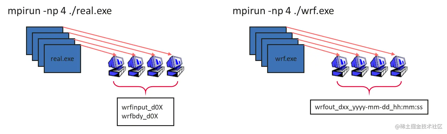 real.exe和wrf.exe可以通过mpi并行运算来提升计算速度,例如