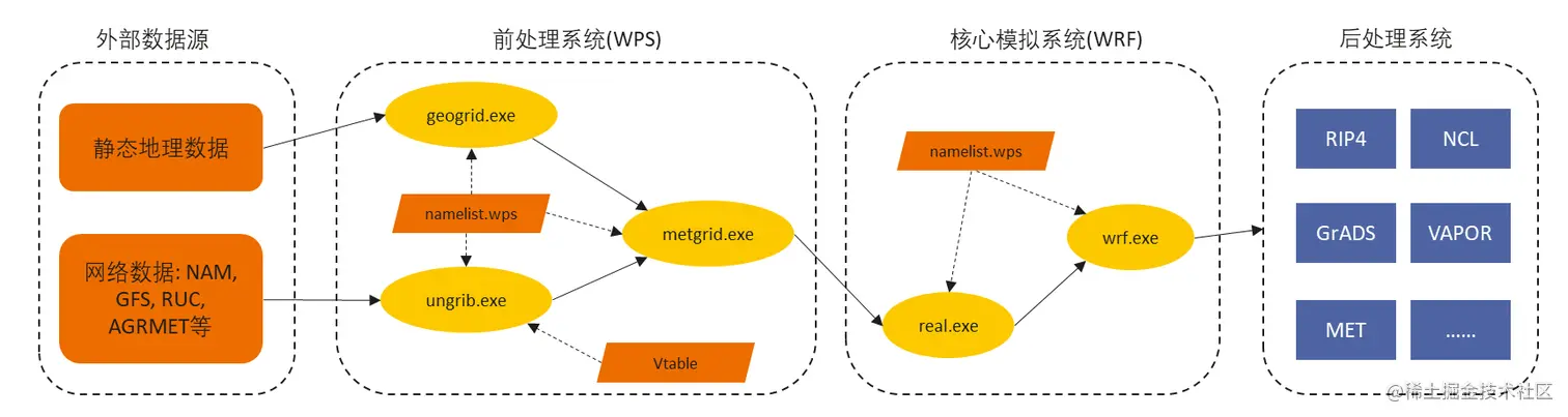 由于WRF包含多个模块,因此处理流程可能不尽相同,这里仅以WPS和WRF这两个模块为例介绍一下完整的WRF流程: