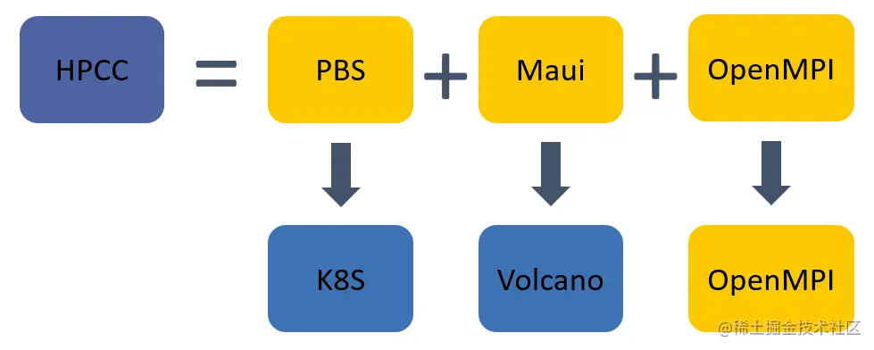 上面介绍了一个HPCC包括资源管理器,调度器和mpi并行计算库三部分,其中资源管理器由Kubernetes负责,调度器由Volcano负责。