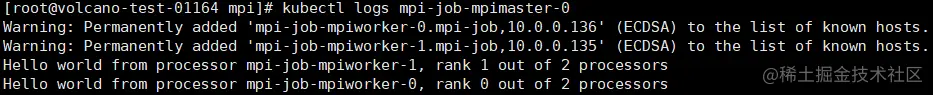 通过上述执行结果可以看出,在作业执行结束后,Volcano只清理worker pod,保留master pod,这样用户kubectl命令获取执行结果。