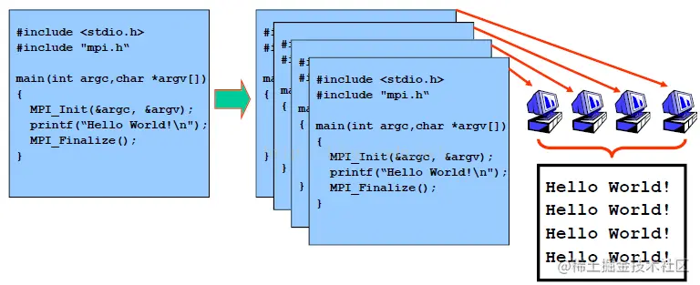 • 调用openmpi或者其他mpi的库来编写源代码,例子里就是输出hello world字符串了