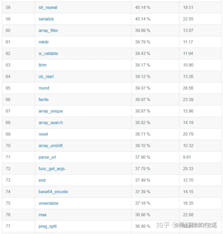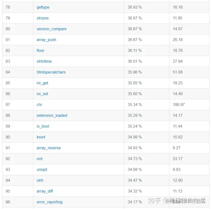 这些函数被命名使用,并从 1 到 100 进行排序。 其他的 4500 个函数现在还没在排名中。 下面频率列表表示在 PHP 代码中使用此函数的频率:参考资料来自于 1900 个 PHP 开源项目。 他们使用了 Exakat static analysis engine 静态分析引擎的 1.2.5 版本进行了审核。平均值是在一个项目中调用此函数的次数。有些函数是被封装使用的,而另一些则是主要函数。