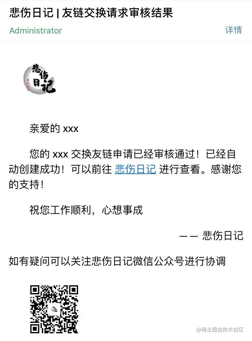 subject: '悲伤日记 | 友链交换请求审核结果',