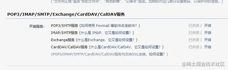 - 翻到POP3/IMAP/SMTP/Exchange/CardDAV/CalDAV服务