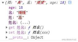 如图为什么会显示 姓名:(...) 呢? 这其实是一个get set,浏览器在显示这个姓名的时候就打印出 姓名:(...) ,这说明我们可以在需求三中对姓名进行读和写,但是并不存在一个叫做姓名的属性,而是有get和set来模拟对姓名进行的操作。