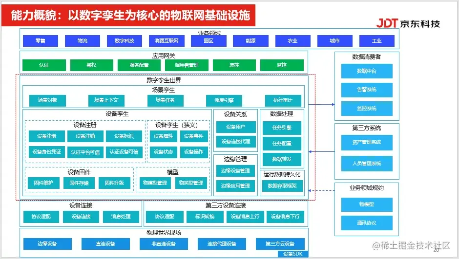 地产/社区领域 与消费领域有着内在的联系。智能家居领域的设备接入往往从设备设计阶段就开始,大量工作都产生在产品研发阶段,发布之后偏向解决并发性能问题和连接稳定性问题;但是在更广泛的ToB领域,IoT连接设备众多,且连接的协议不同,顶层标准设计缺失,没有统一的标准和规范,甚至项目开始时设备已经安装完,导致设备互联互通充满挑战。进入地产领域,京东在这些问题上积累了较为丰富的经验。基于京东物联网基础能力,为地产商、社区服务商和物业服务人员提供整套基于场景的解决方案和IoT技术能力。