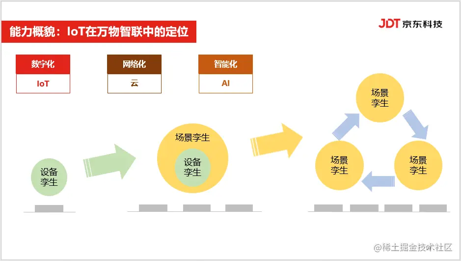 针对这些发展方向,京东科技在IoT技术方面做了很多探索。目前,业内比较常用的说法,就是“数字化、网络化、智能化”,这是一些物联网或和工业互联网发展一定绕不开的名词。京东科技认为,简单的表述,数字化由IoT技术承载,网络化靠云能力支撑;智能化发挥AI的优势。
