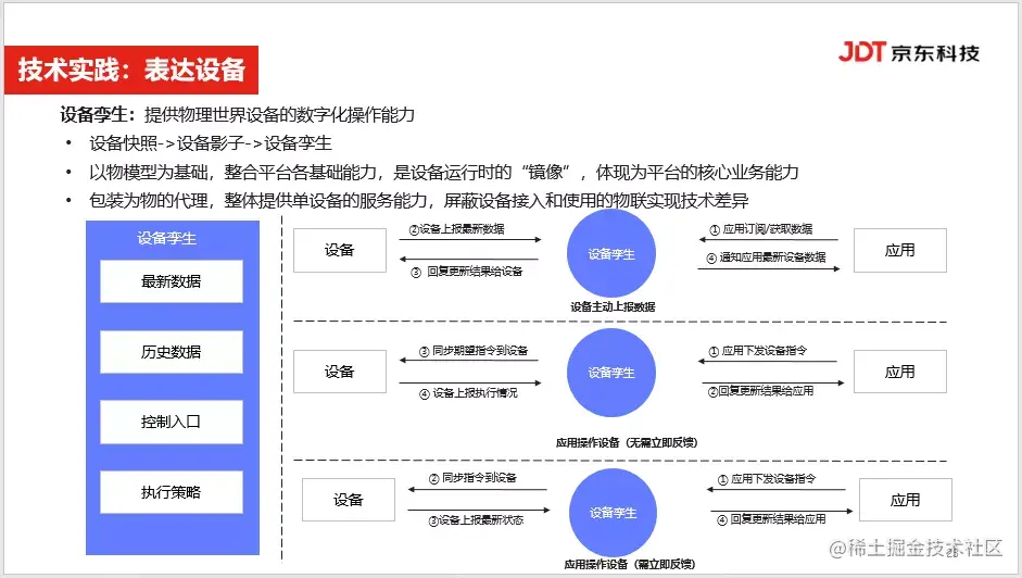 3. 表达设备。 京东科技在核心代码中深度实现基于物模型的物能力描述方式,结合上下行数据流,实现设备的数字化表达,进而提供物理世界设备的数字化“看”和“动”的能力-设备孪生。值得注意的是,结合实际应用场景和认知深入,京东IoT在设备表达上经历了一些关键的技术实践变化,从最开始的“设备快照”,演进到后来的“设备影子”,直至现在的设备孪生。
