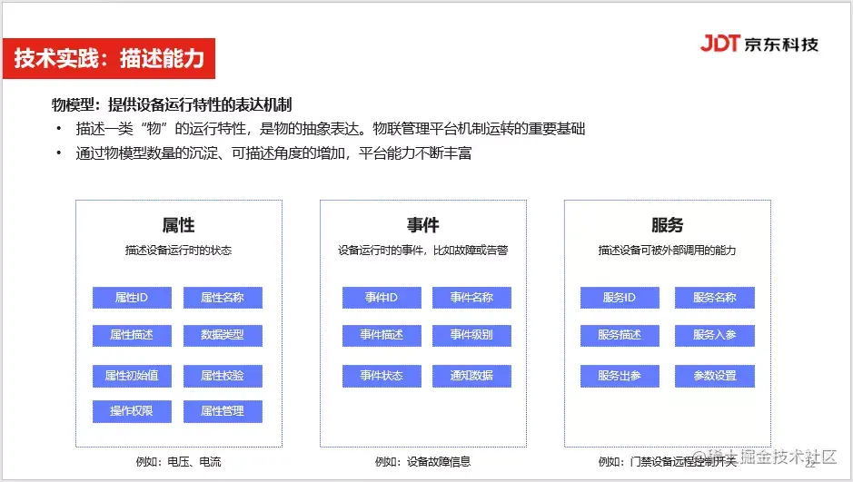 2. 描述能力。 设备连接后,通过代码方式实现设备的交互逻辑,是一种比较容易的方式,但这种方法的工程效率不一定高。为了解决这类问题,京东科技采用物模型来表达设备运行特性。物模型是京东科技物联管理平台运转的重要基础,简单来说就是“属性、事件、服务”,模型之间可以存在嵌套,以反映物理世界对象之间的关系。通过物模型数量的沉淀、可描述角度的增加,平台能力正在不断提升。