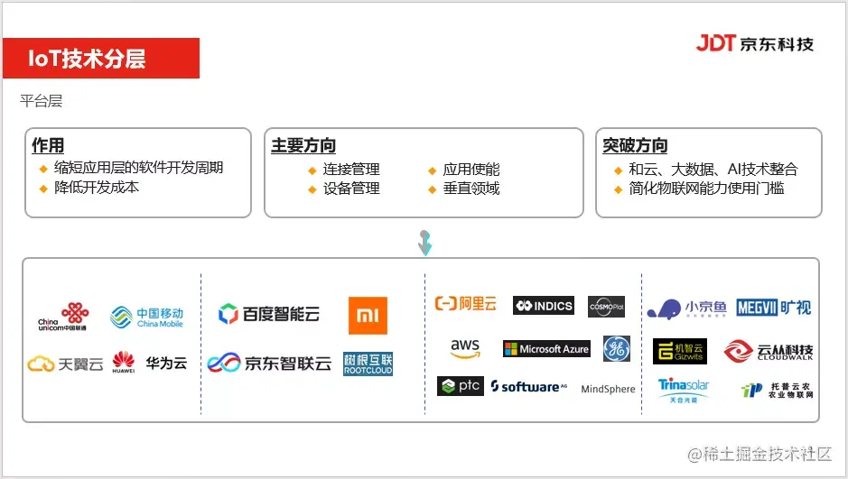 平台层的主要涉及连接管理、应用使能、设备管理与垂直领域效率提高,未来的突破方向可以向着与云、大数据、AI技术与IoT平台结合的方向,降低物联网能力的使用门槛。