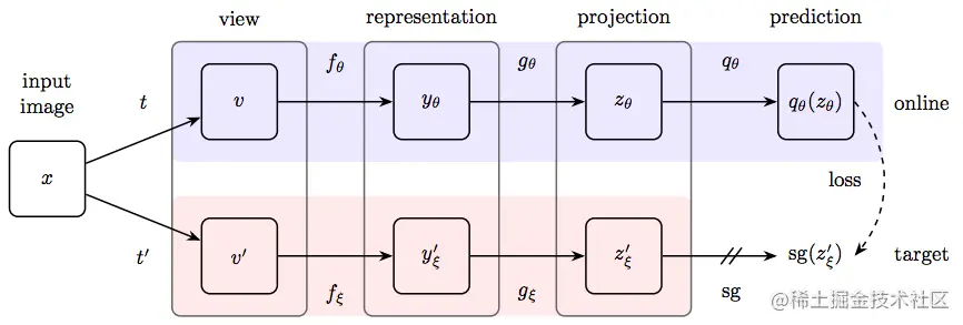 我们现在有,经过encoder,得到,经过prejector,得到,经过predictor,得到;同理,target network也是如此,只是没有最后的predictor,最终得到。