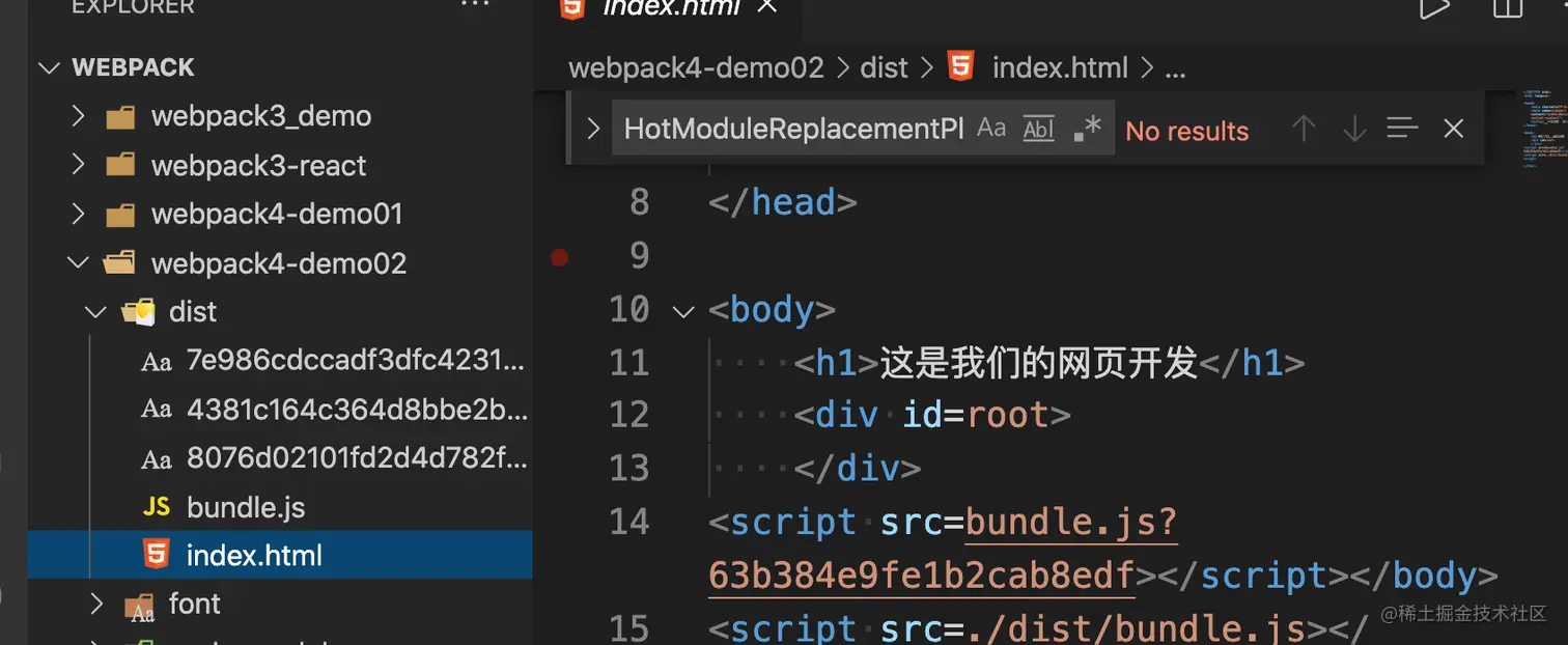 执行命令后 在 dist 目录下有一个 index.html 和 bundle.js;同时 index.html 已经自动引入了 bundle.js, 查看 bundle.js 文件看到代码也是压缩的 js 文件