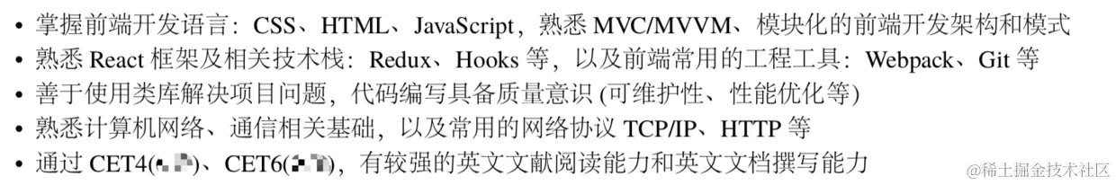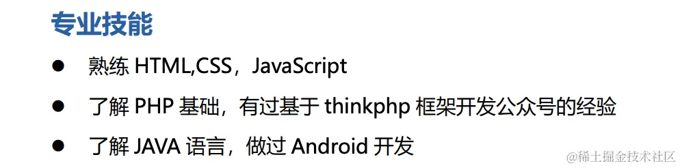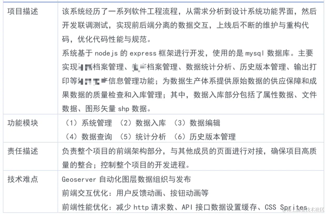 当然你如果有其他技术相关的,也可以补上。比如单独一节写社区贡献,“在掘金知乎开个人技术专栏,写了 N 篇博文,其中一篇还获得 XX 访问量,被首页推荐过”,“nodejs 的贡献者之一,提过 N 个 MR 被采纳”,“XX 框架的中文翻译者之一”,“XX 前端技术会议做过展台分享”,诸如此类,也是挺赞的。