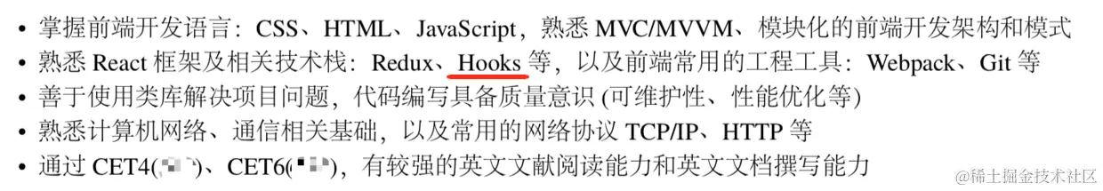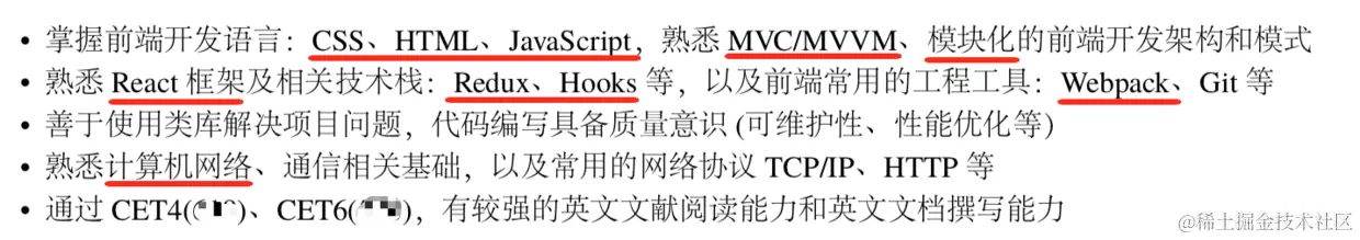 然后,重点来了,项目经历。看什么,关键词!诸如写了 XX 论文、参加社会实践,很快扫过去,重点还是” 在线系统开发 “、” 某某小程序开发 “、”XX webapp 开发 “、” 某个开源组件作者 “之类的项目上。然后一大段关于项目的介绍和描述没多大用,重点还是项目里面透露出来的技术能力、技术关键字,比如” 应用 Service Worker 做了 XX“、“基于 React Hook”、“实现了完善的单元测试”、“应用了某某思路提升了页面的打开时间”,等等等等,都令我感兴趣。如果这些都没有,就干巴巴地写了用了 React+Redux ,用了 node+Koa,或者干脆都在讲开发了哪些哪些页面,基本都很快放弃。