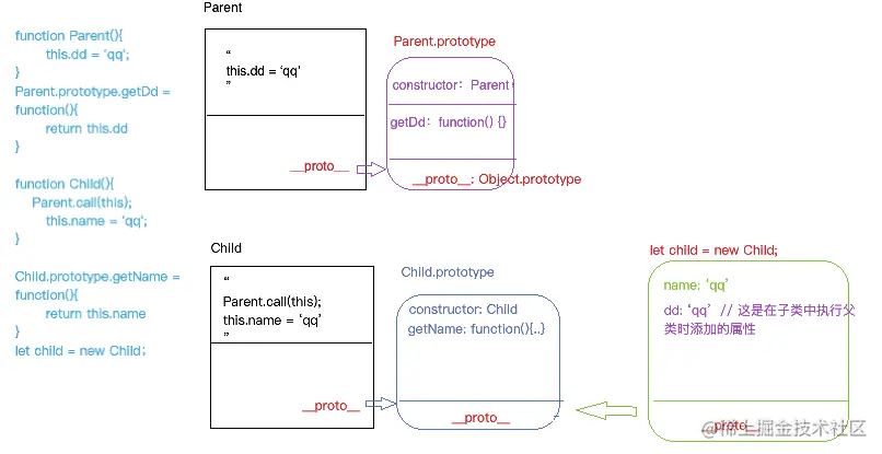 我们添加了 Parent.call(this);这样一行代码,在子类中调用父类执行并强制将Parent中的this修改为子类的实例对象child,此时Parent执行时this.dd = 'qq'相当于给实例child上添加属性dd.相当于让子类的实例继承了父类的私有的属性,并且也变为了为子类私有的属性"拷贝式"