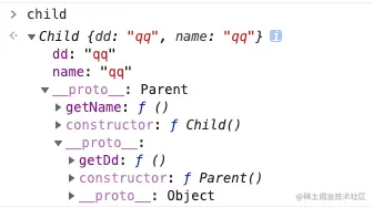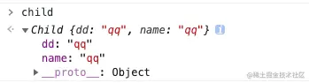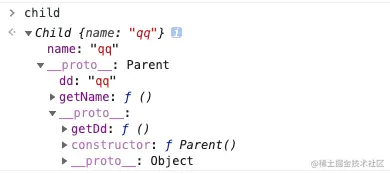 child.__proto__方向进行查找,找到属性dd: 'qq', getName: function ... -